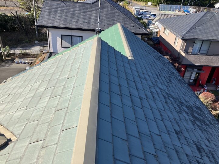 既存の屋根材はセメント瓦です。セメントと川砂を重量比で練り混ぜたモルタルを型に入れて成形したもので、形状により和形、洋型、平型、S型等の種類があります。セメント瓦もカラーベストと同様に、それ本体には防水性がほとんどありません。また塗料で着色するので、どんな色にすることが出来ます。ただ経年劣化によりセメントの成分が取れ瓦が「スカスカ」になり、色落ちしたり表面が劣化してきたりします。 -