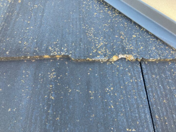 既存屋根材はスレート屋根です。石質の薄い板を使用しているため、劣化や反りがしやすい材料です。 -