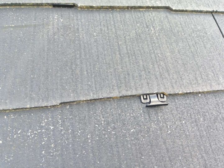 既存屋根材はスレート屋根です。石質の薄い板を使用しているため、劣化や反りがしやすい材料です。 -