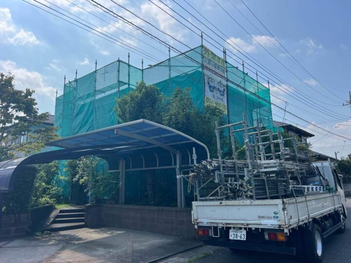 足場の組立・メッシュシートの取付が完了しました。安全且つご近所様への配慮になります。