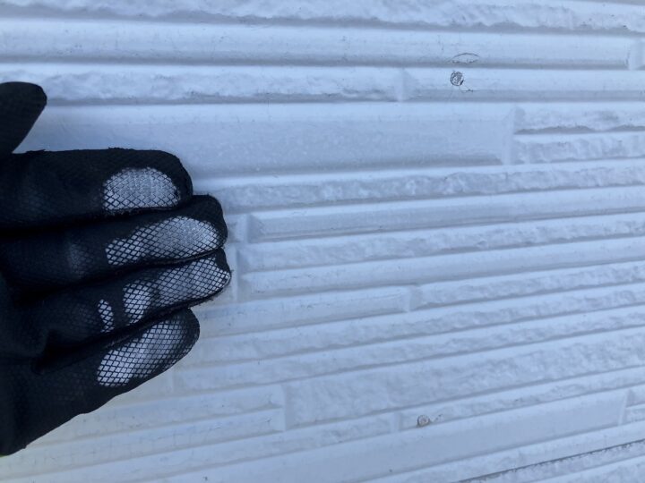 紫外線による影響から、塗料の劣化を示すチョーキングが発生しております。しっかりと高圧洗浄で汚れを落とし、塗装をする必要があります。