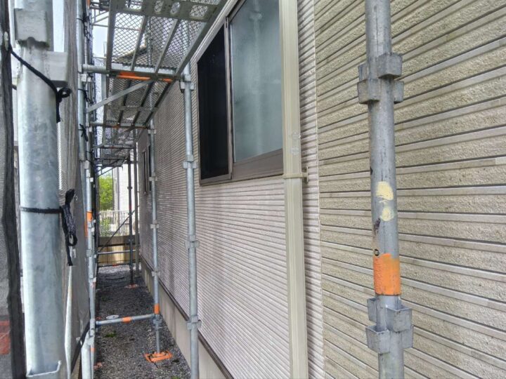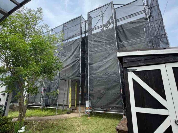 足場の組立・メッシュシートの取付が完了しました。安全且つご近所様への配慮になります。