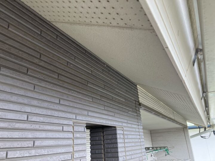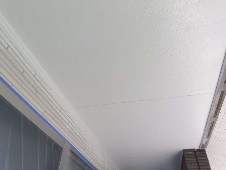 軒天部分にカビが見受けられます。今回、防カビ成分の入った軒天専用塗料を塗布することで素材を長持ちさせることができます。