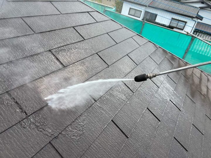既存屋根材はスレート屋根です。石質の薄い板を使用しているため、劣化や反りがしやすい材料です。 -