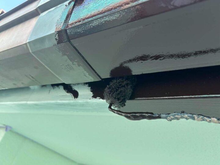 棟板金は積水ハウス特有のエンビ鋼板製になります。エンビ部分が剥離して、中の鋼板部分が錆びています。しっかりとケレンを行い、下塗り処理をしてからの塗装が重要になります。 -
