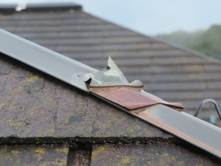 棟板金は積水ハウス特有のエンビ鋼板製になります。エンビ部分が剥離して、中の鋼板部分が錆びています。しっかりとケレンを行い、下塗り処理をしてからの塗装が重要になります。 -