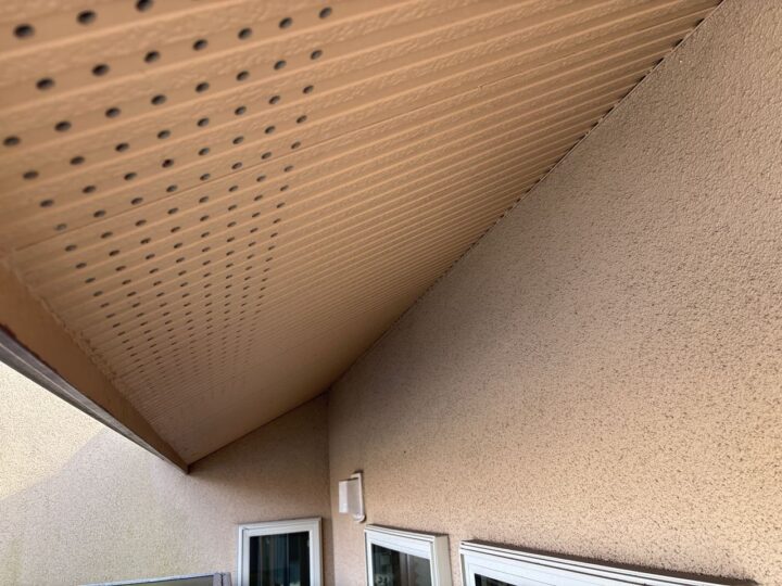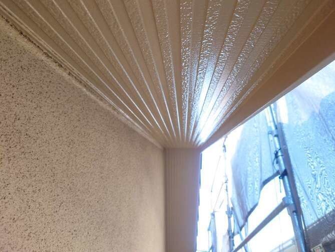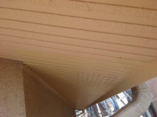 軒天部分の褪色が見受けられます。今回、軒天専用塗料を塗布することで素材を長持ちさせることができます。 -