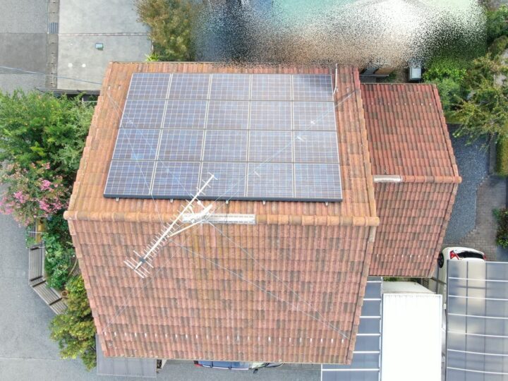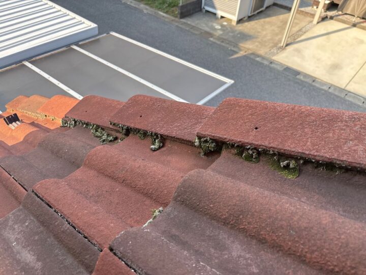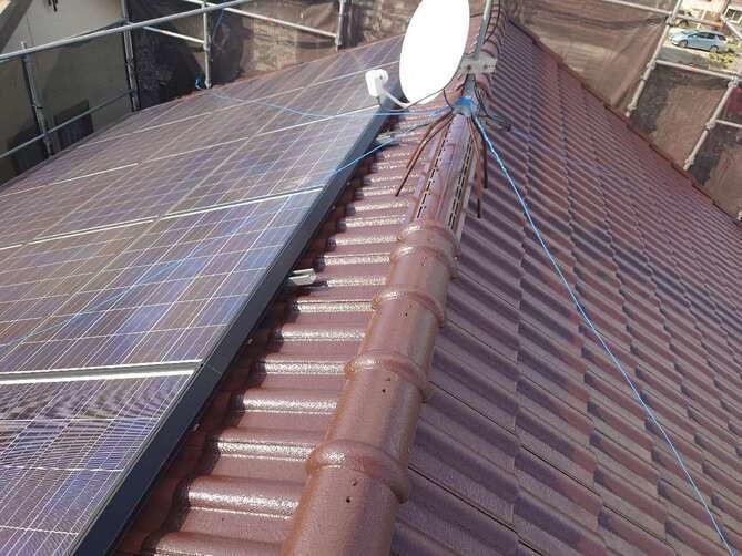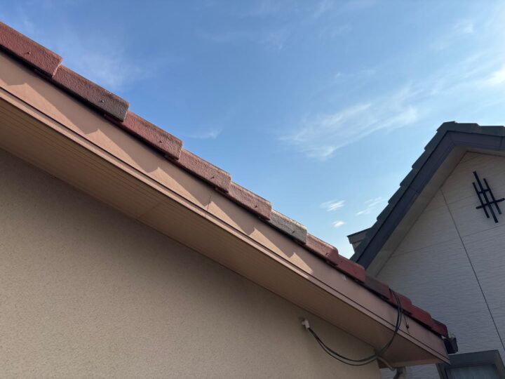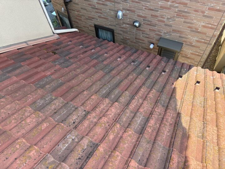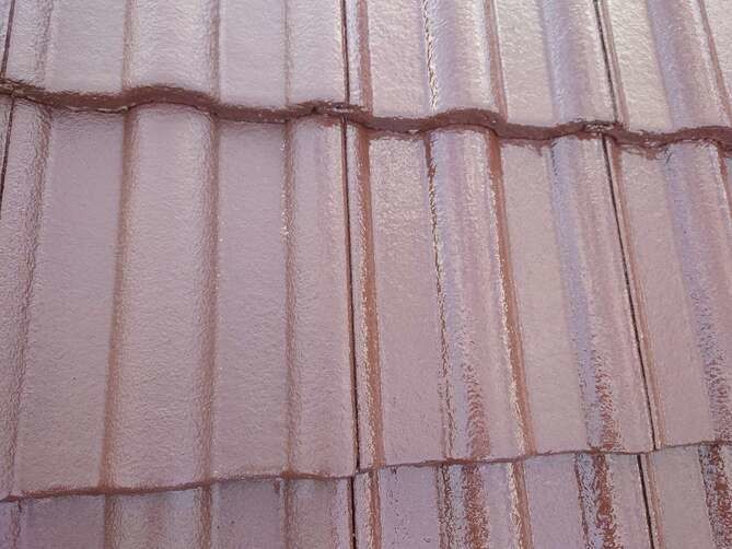 既存屋根材は乾式コンクリート瓦(モニエル瓦)です。スラリー層を高圧洗浄でしっかりと除去をし、専用シーラーを2回塗布し、早期剥離を予防する必要があります。 -