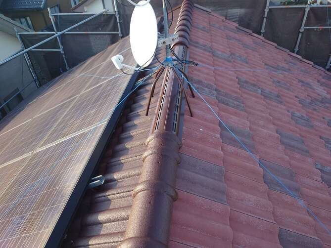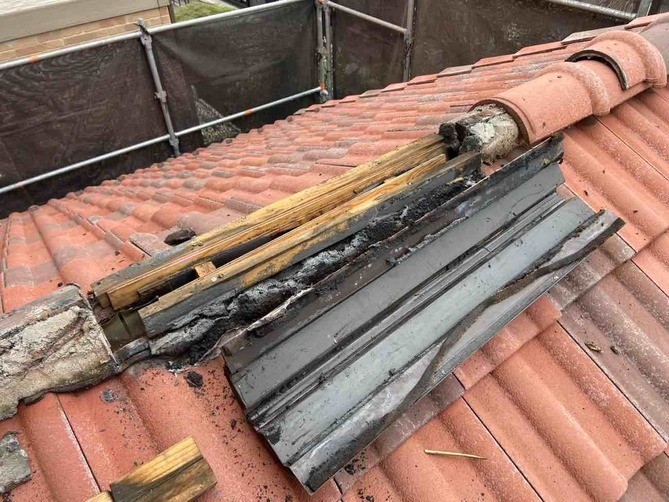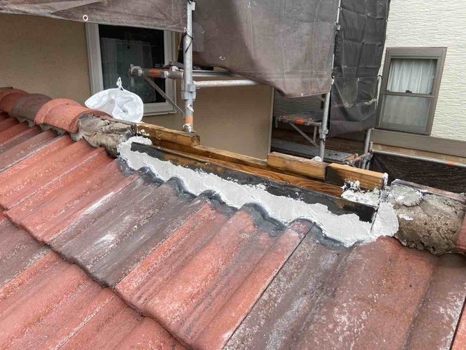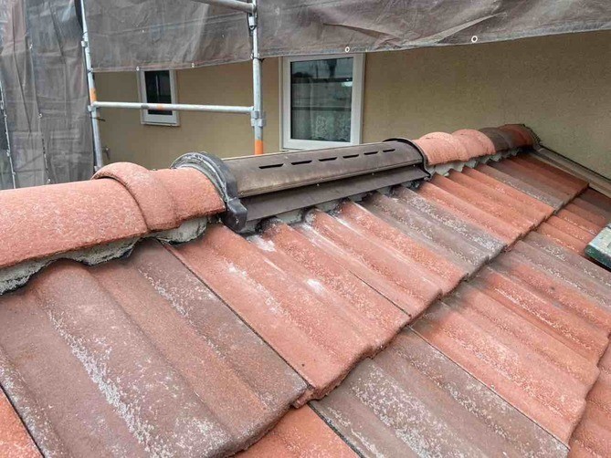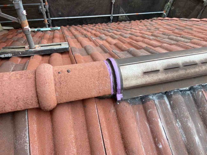 換気棟と瓦のつなぎ目のシーリングを行っています。 -