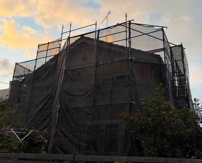 足場の組立・メッシュシートの取付が完了しました。安全且つご近所様への配慮になります。 -