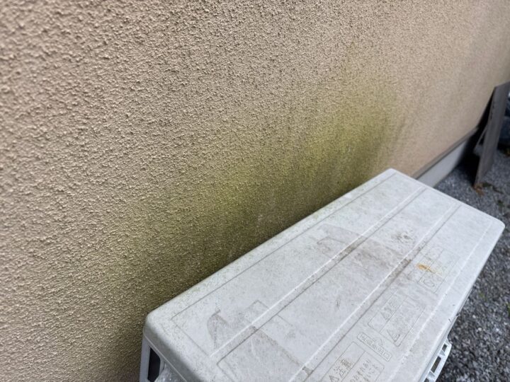 外壁材に一部カビ・コケが発生しているところがあります。低汚染塗料の使用や専用の添加剤を塗料に混ぜることで、カビ・コケの発生を抑制することができます。 -