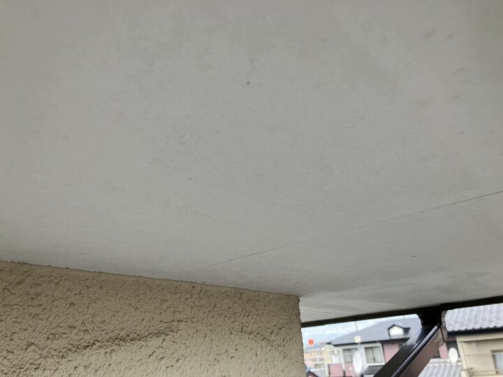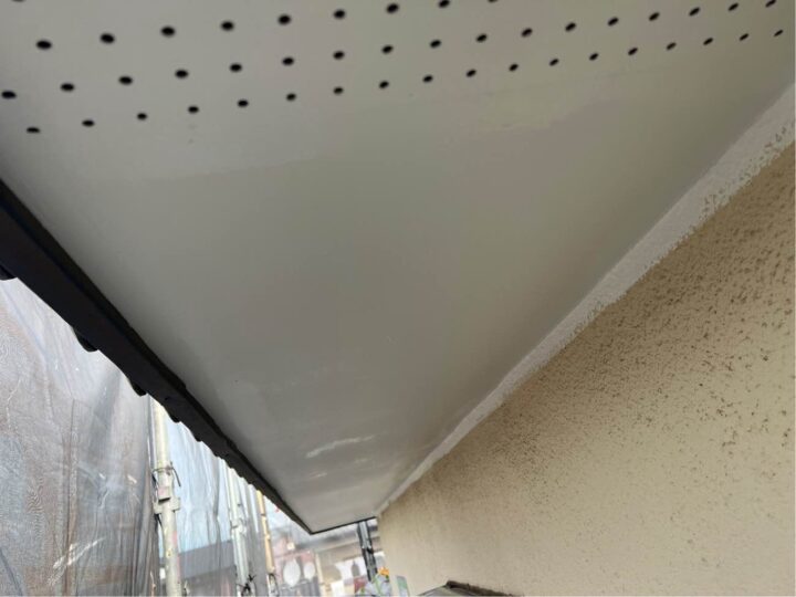 軒天部分の褪色が見受けられます。今回、軒天専用塗料を塗布することで素材を長持ちさせることができます。 -