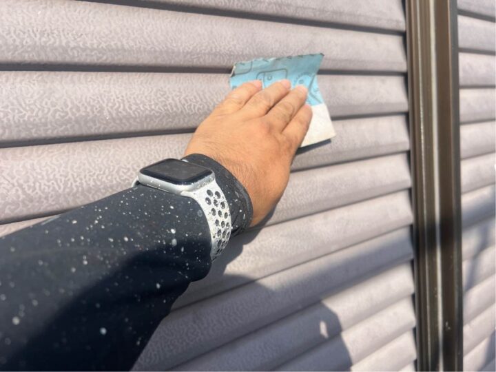 紫外線による影響から、塗料の劣化を示すチョーキングが発生しております。しっかりと高圧洗浄で汚れを落とし、塗装をする必要があります。 -