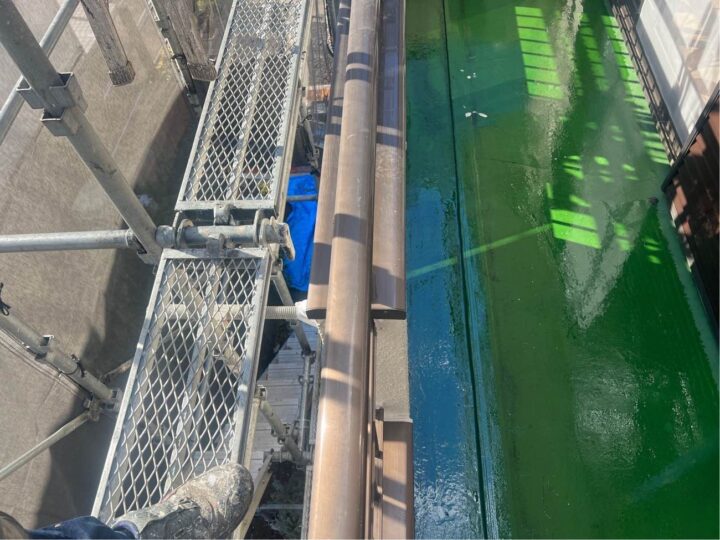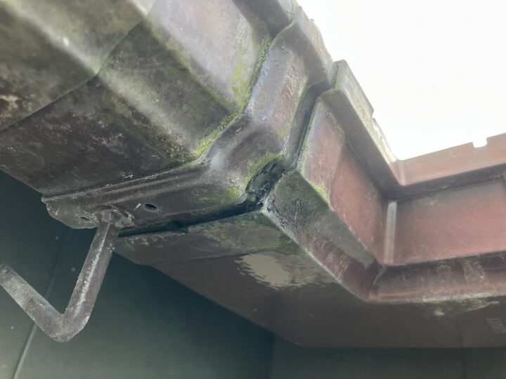 雨樋のチョーキングが見受けられます。また、ジョイント部分やコーナー部分など劣化が進行しているため、今回、推奨工事といたしましては、交換されることを推奨します。