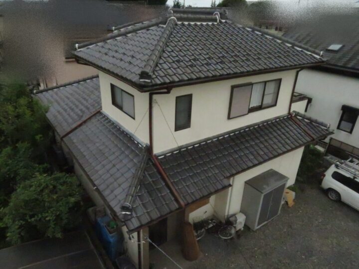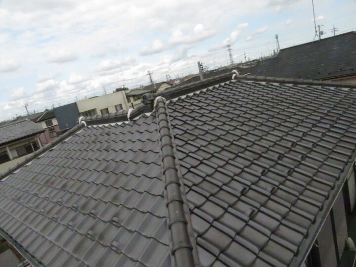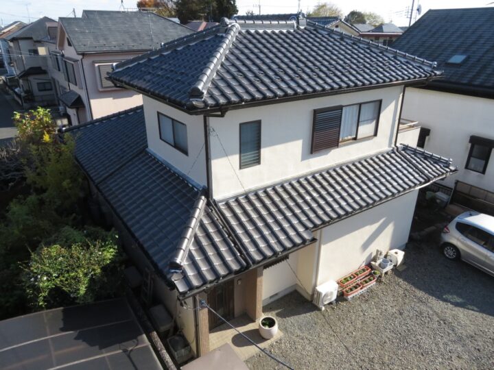 既存屋根材は陶器瓦です。ガラス質の釉薬を施し焼成して作られているため、退色しにくいのが特徴です。 -