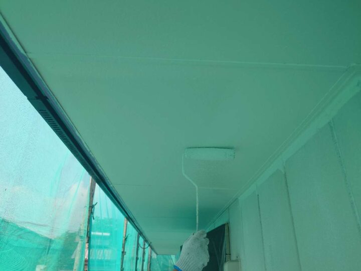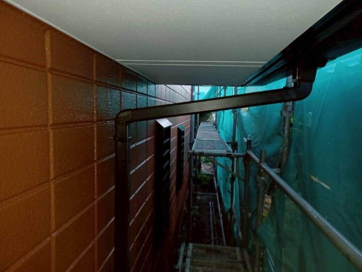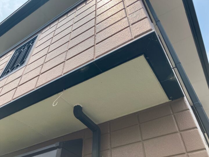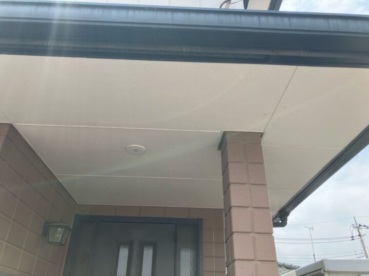 軒天部分の色褪せが見受けられます。今回、軒天専用塗料を塗布することで素材を長持ちさせることができます。 -