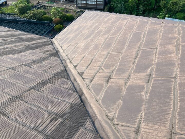 既存屋根材はスレート屋根です。石質の薄い板を使用しているため、劣化や反りがしやすい材料です。 -