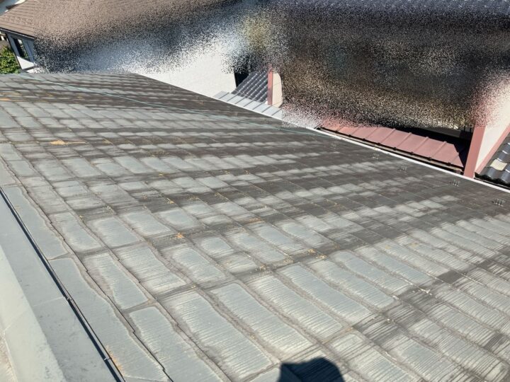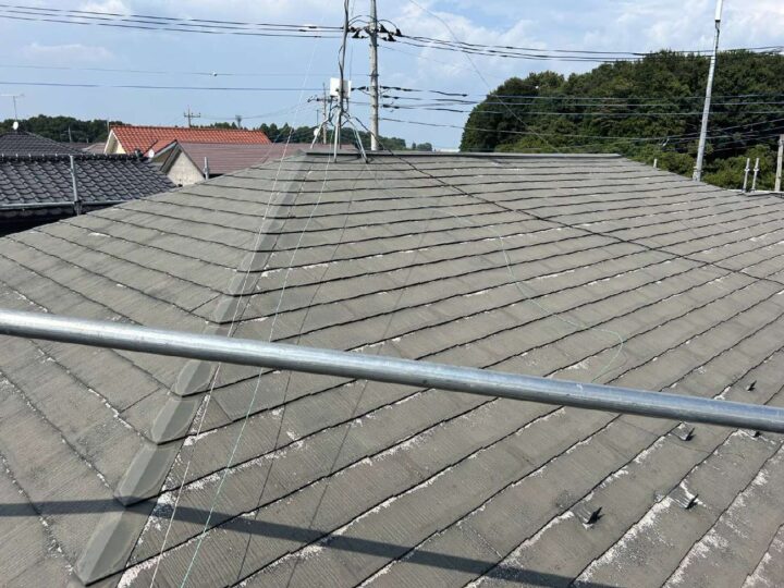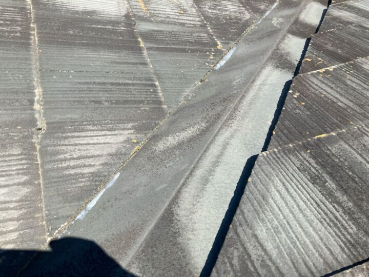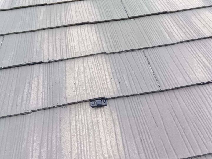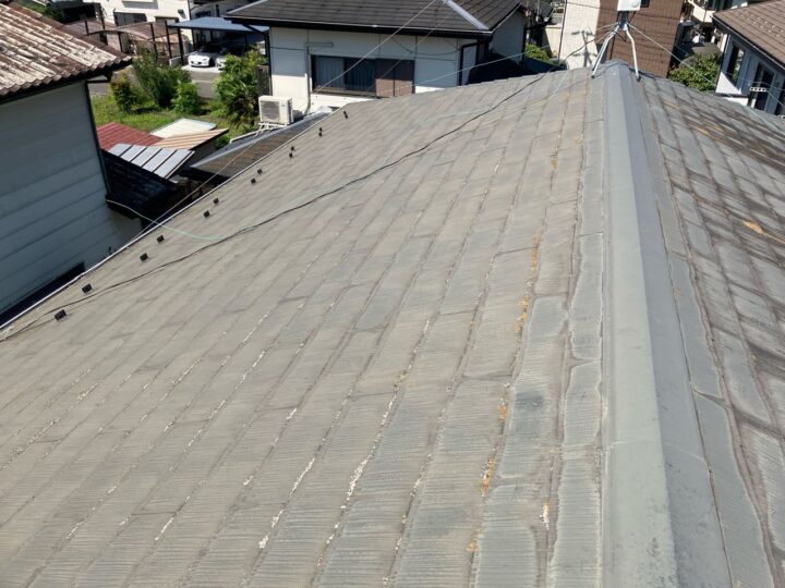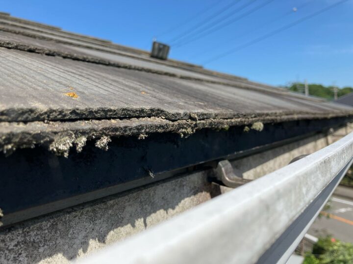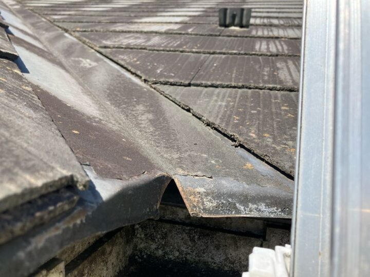既存屋根材はスレート屋根です。石質の薄い板を使用しているため、劣化や反りがしやすい材料です。 -
