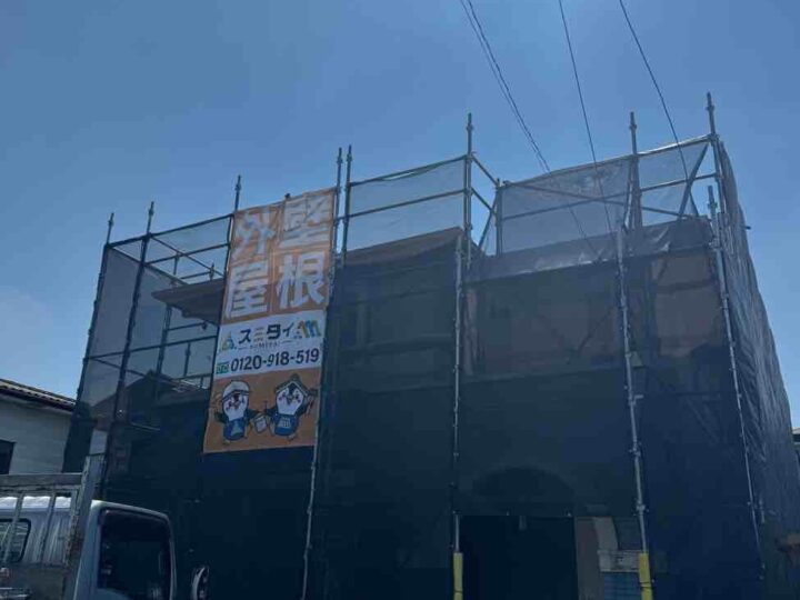 足場の組立・メッシュシートの取付が完了しました。安全且つご近所様への配慮になります。 -