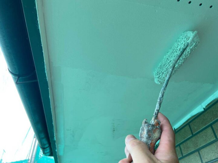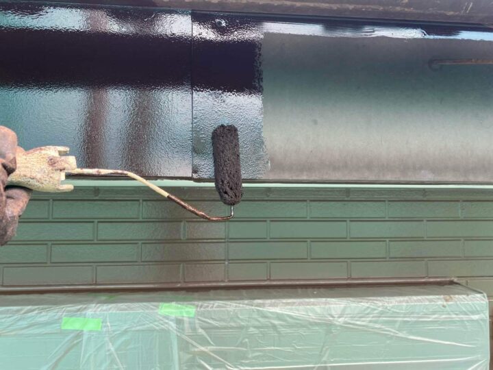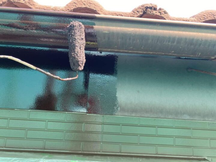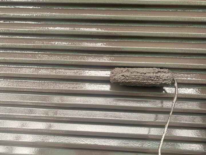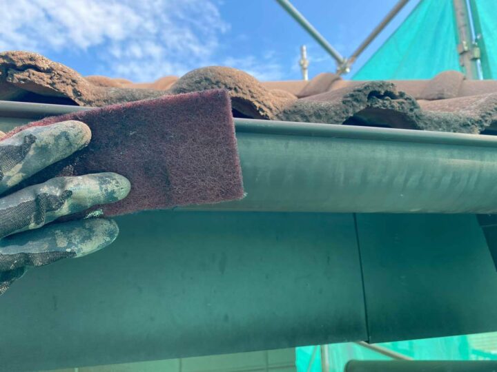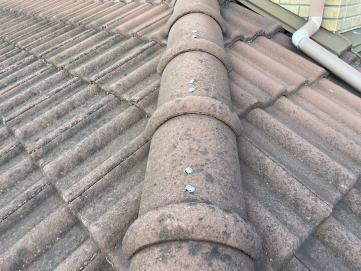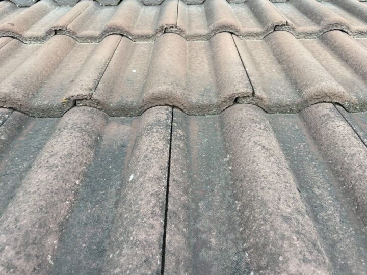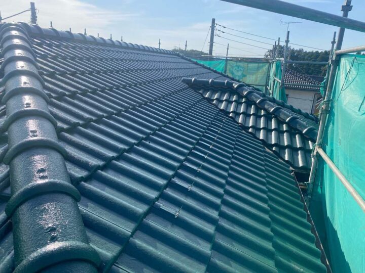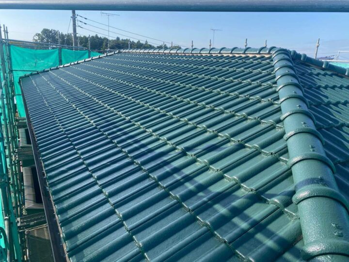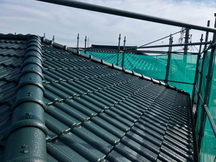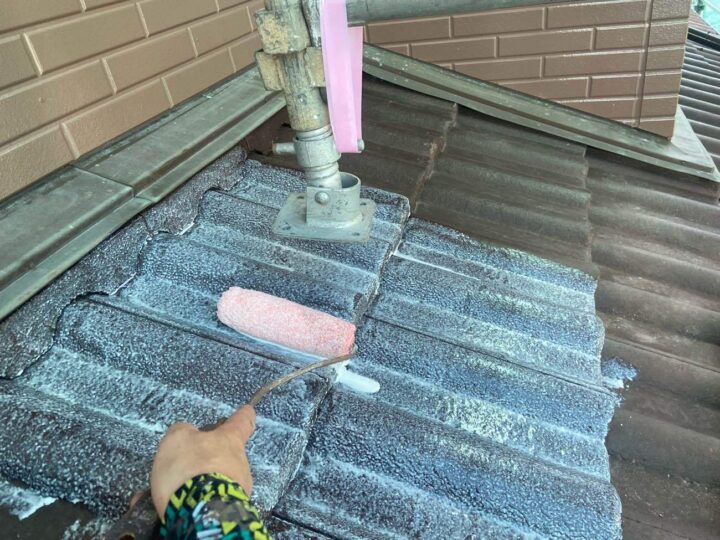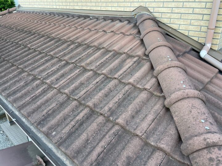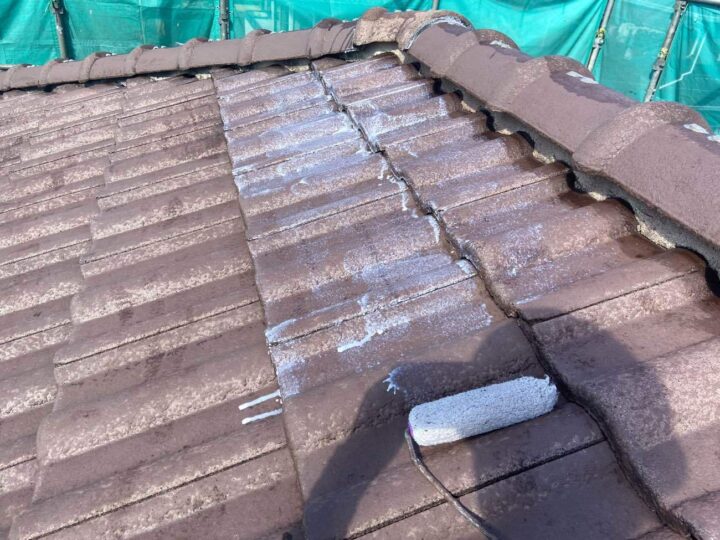 既存屋根材は乾式コンクリート瓦(モニエル瓦)です。スラリー層を高圧洗浄でしっかりと除去をし、専用シーラーを2回塗布し、早期剥離を予防する必要があります。 -