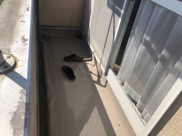 既存バルコニーは塩ビシートです。側溝部と平場にて異なる素材となっており特殊仕様となっております。