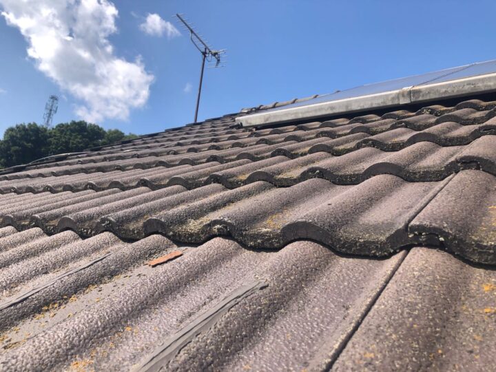 既存の屋根材はセメント瓦です。セメントと川砂を重量比で練り混ぜたモルタルを型に入れて成形したもので、形状により和形、洋型、平型、S型等の種類があります。セメント瓦もカラーベストと同様に、それ本体には防水性がほとんどありません。また塗料で着色するので、どんな色にすることが出来ます。ただ経年劣化によりセメントの成分が取れ瓦が「スカスカ」になり、色落ちしたり表面が劣化してきたりします。 -