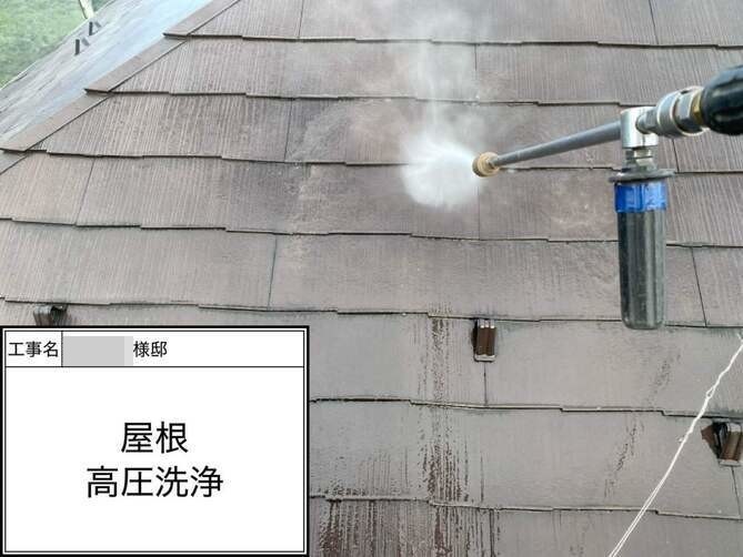 屋根の洗浄作業を行っています。 -