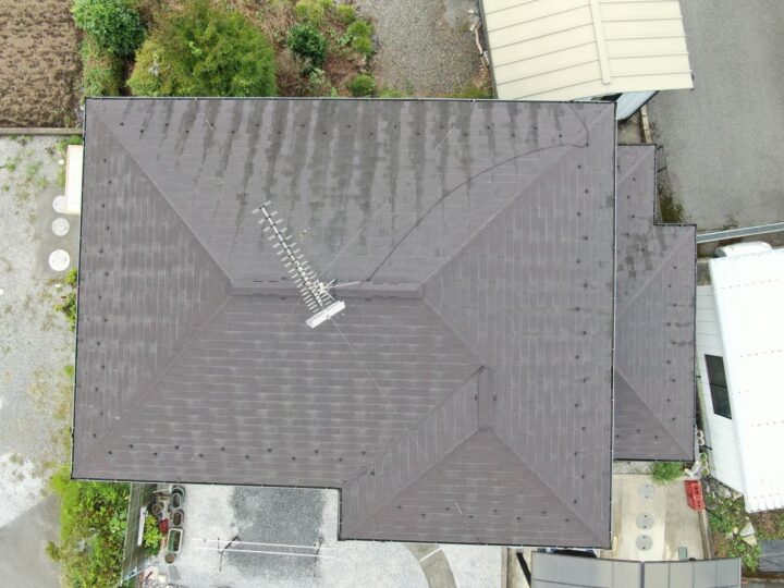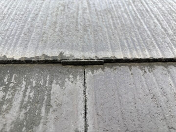 既存屋根材はスレート屋根です。石質の薄い板を使用しているため、劣化や反りがしやすい材料です。 -