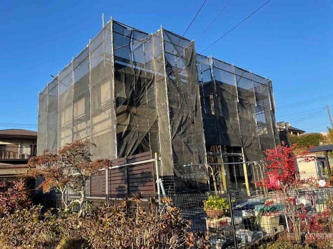 足場の組立・メッシュシートの取付が完了しました。安全且つご近所様への配慮になります。 -
