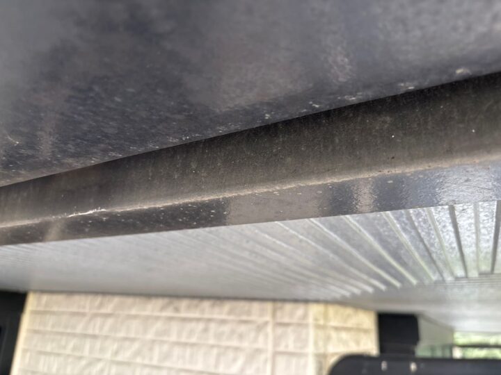 破風は塩ビ鋼板です。紫外線の影響により塩ビ鋼板が劣化すると塩ビが剥がれ錆びて腐食していきます。また、塩ビ部分を塗装する際は専用プライマーを塗布する必要がございます。 -