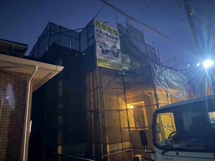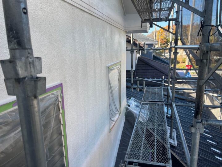 足場の組立・メッシュシートの取付が完了しました。安全且つご近所様への配慮になります。 -