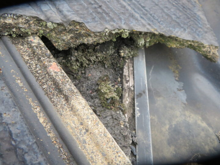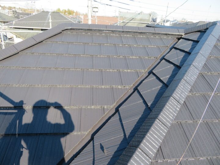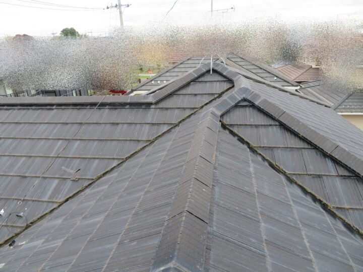 既存の屋根材はセメント瓦です。セメントと川砂を重量比で練り混ぜたモルタルを型に入れて成形したもので、形状により和形、洋型、平型、S型等の種類があります。セメント瓦もカラーベストと同様に、それ本体には防水性がほとんどありません。また塗料で着色するので、どんな色にすることが出来ます。ただ経年劣化によりセメントの成分が取れ瓦が「スカスカ」になり、色落ちしたり表面が劣化してきたりします。 -