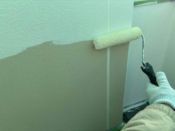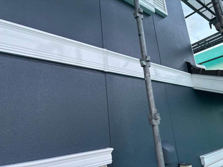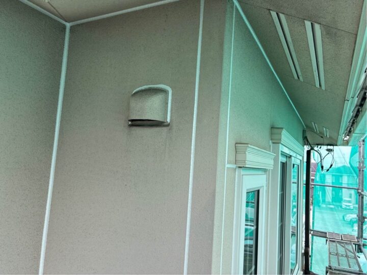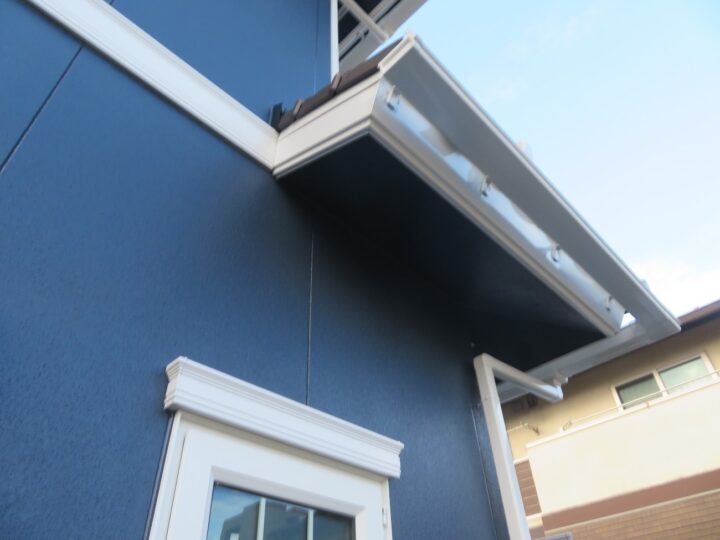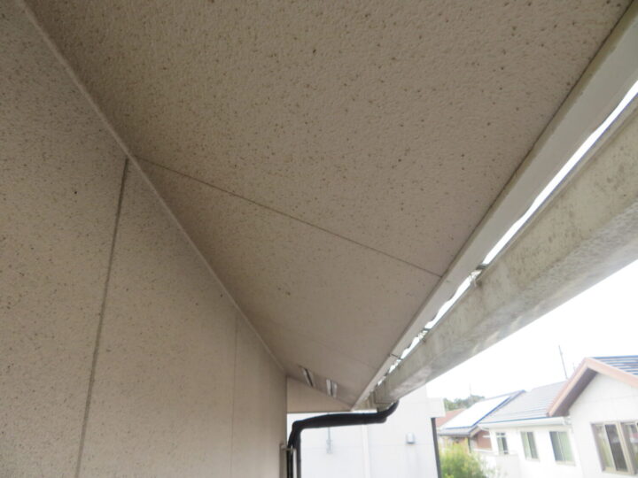 軒天にもリシンが吹き付けてありますので、外壁塗装の面積に含まれます。取り合い部分のシーリングは劣化していますので増し打ちを推奨致します。 -