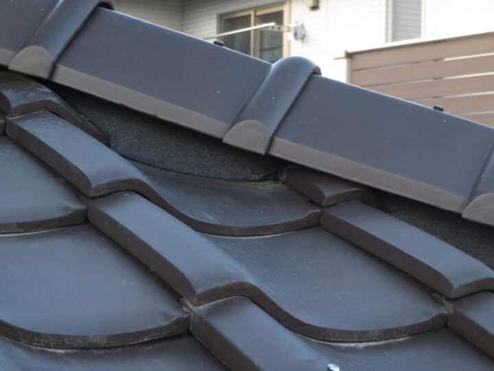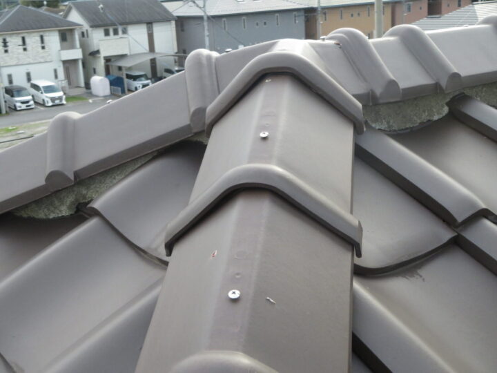 既存屋根材は陶器瓦です。ガラス質の釉薬を施し焼成して作られているため、退色しにくいのが特徴です。 -