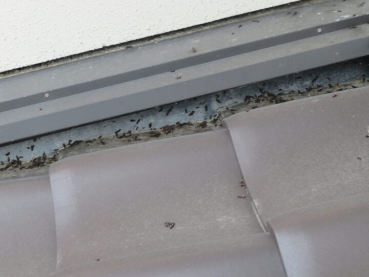 雨押え板金は金属製ですので金属専用の下塗り処理が必要です。板金の下に蝙蝠が入っている可能性が高いので、メッシュシート処理を推奨致します。 -