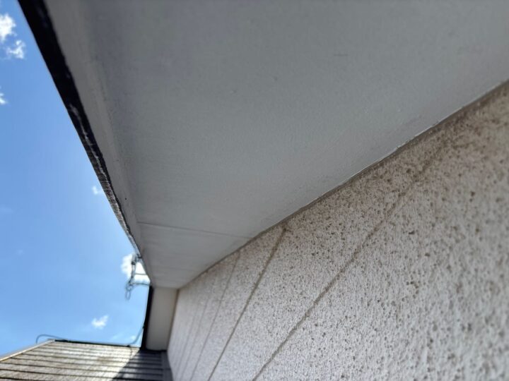 軒天部分の褪色が見受けられます。今回、軒天専用塗料を塗布することで素材を長持ちさせることができます。 -