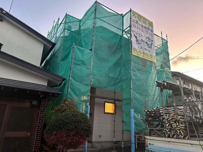 足場の組立・メッシュシートの取付が完了しました。安全且つご近所様への配慮になります。 -