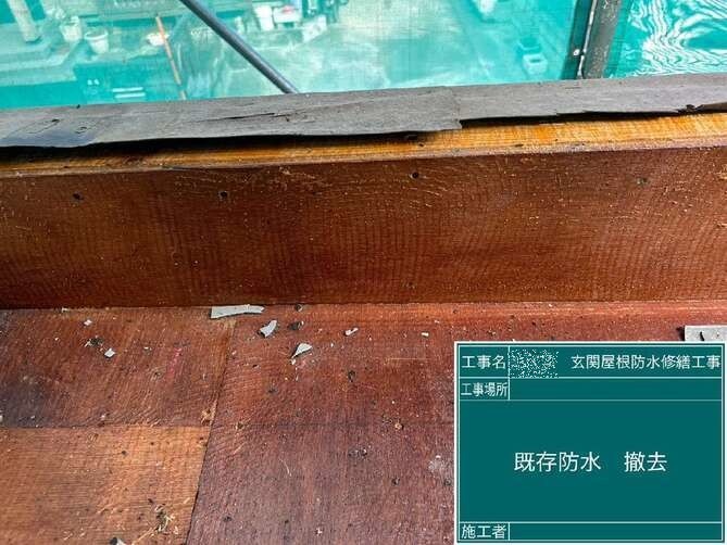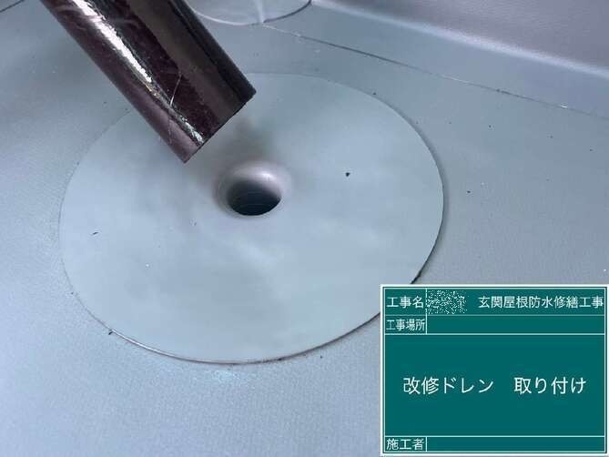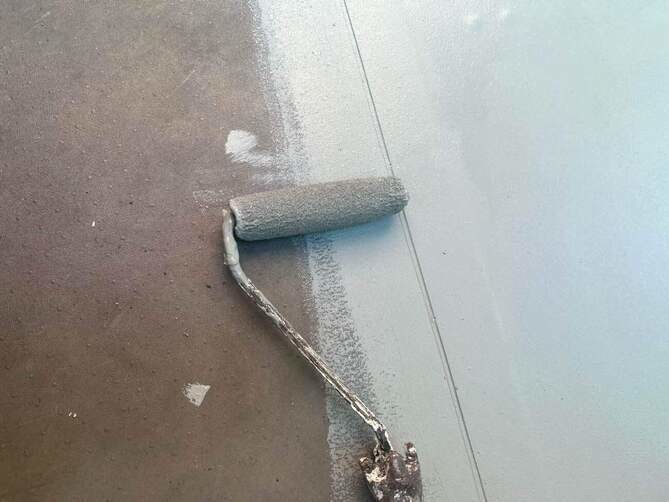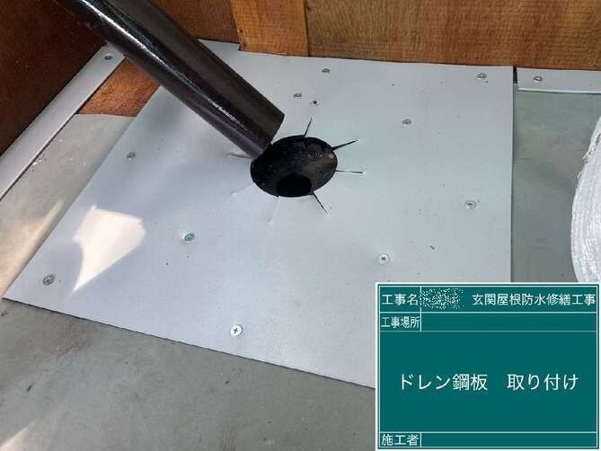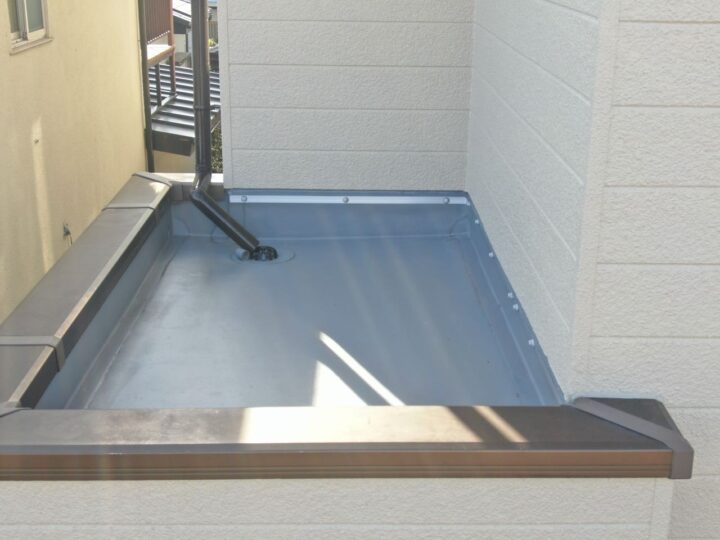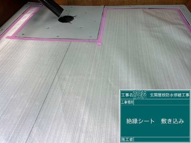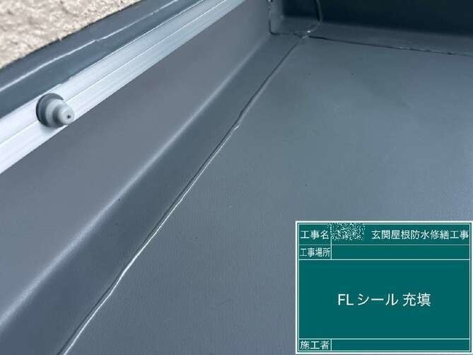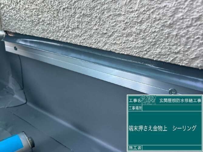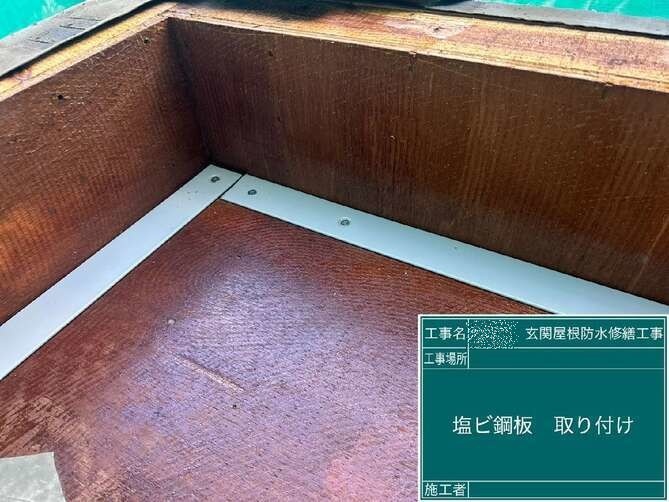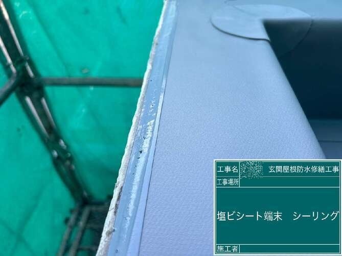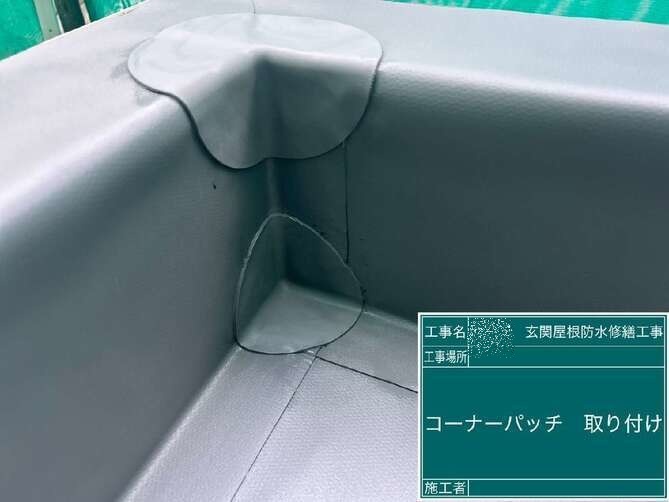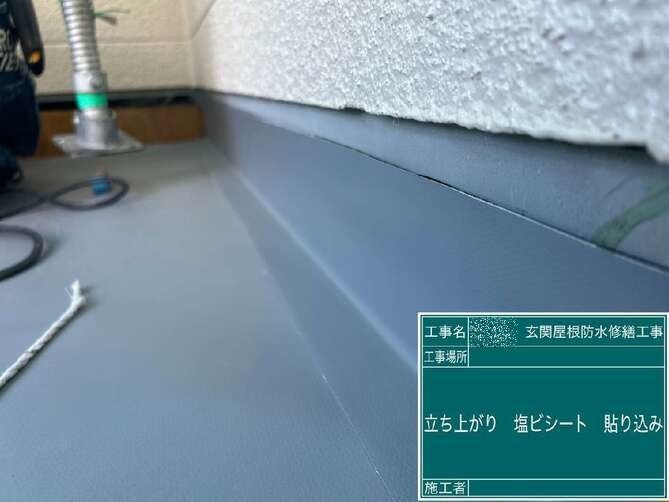 立ち上り部の塩ビシートの貼り込みを行っています。 -