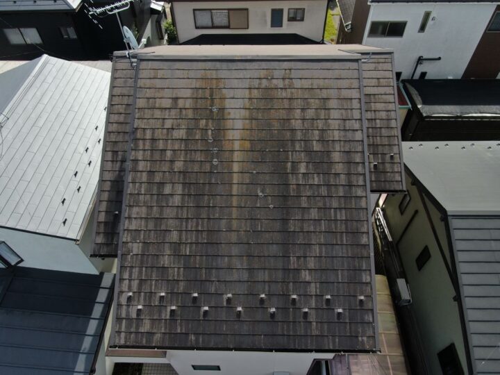紫外線による劣化がひどく褪色が見られ、また全体的にコケが発生しております。 -