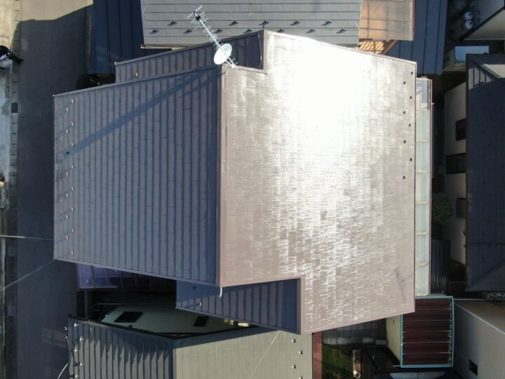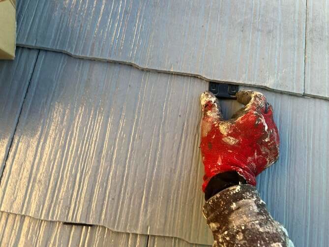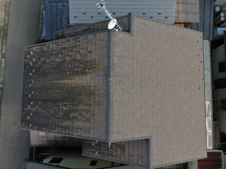既存屋根材はスレート屋根です。石質の薄い板を使用しているため、劣化や反りがしやすい材料です。 -