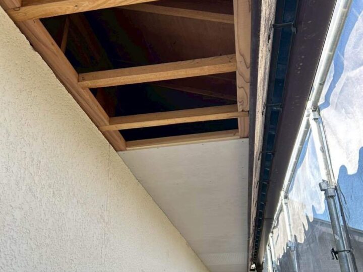 プリント合板の軒天材で剥がれてきている箇所と落ち始めている箇所がございますのでケーカル板に張替えを推奨致します。 -