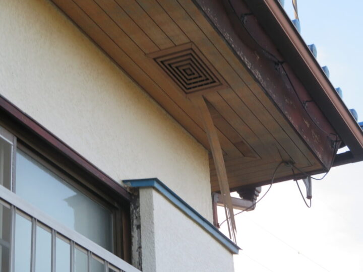 プリント合板の軒天材で剥がれてきている箇所と落ち始めている箇所がございますのでケーカル板に張替えを推奨致します。 -