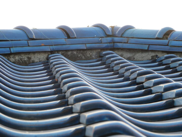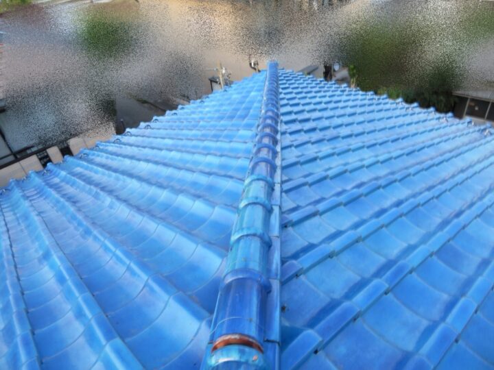 陶器瓦で基本はメンテナンス不要ですが、棟の漆喰が無くなっており、棟がズレてきていますので棟の積み直し工事を推奨致します。 -