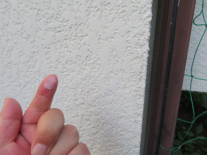 紫外線による影響から、塗料の劣化を示すチョーキングが発生しております。しっかりと高圧洗浄で汚れを落とし、塗装をする必要があります。 -