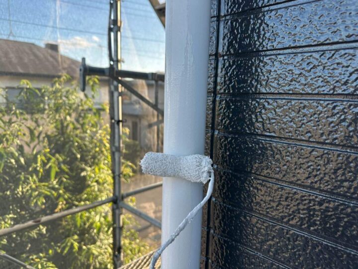 雨樋の上塗りを行っています。 -