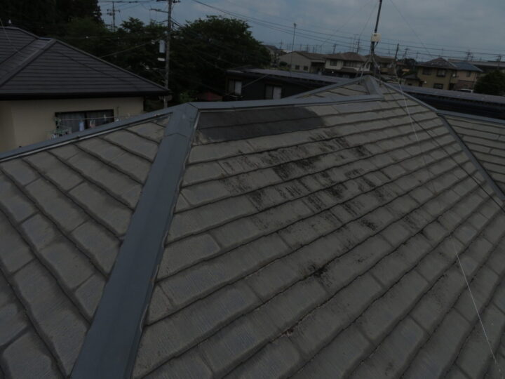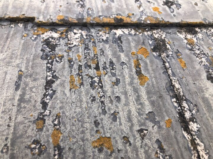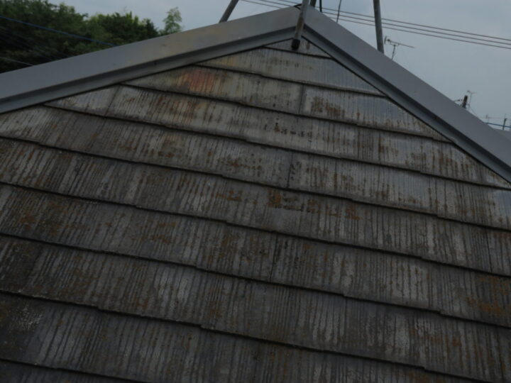 既存屋根材はスレート屋根です。石質の薄い板を使用しているため、劣化や反りがしやすい材料です。 -