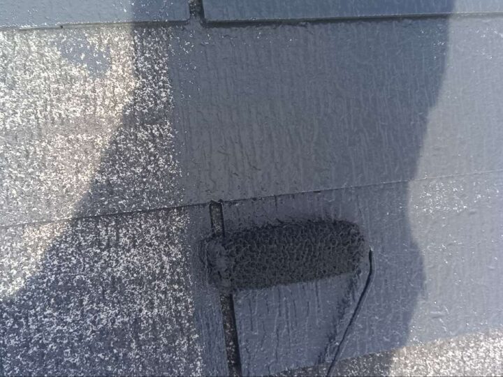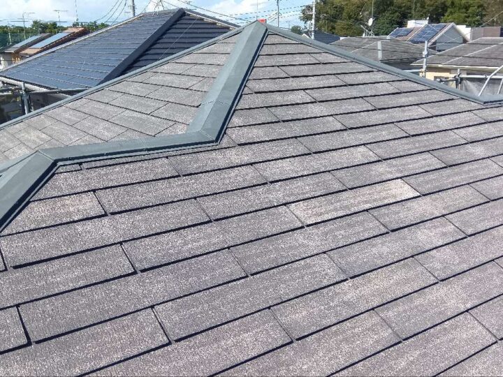 屋根材を近くから確認すると表面塗膜の剥がれが始まっております。なるべく早めに塗装工事施工することをお奨めします。 -