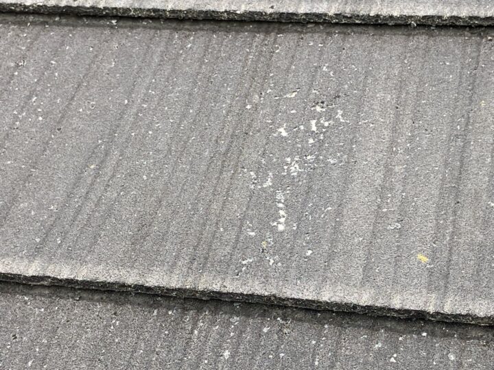 屋根材を近くから確認すると表面塗膜の剥がれが始まっております。なるべく早めに塗装工事施工することをお奨めします。 -