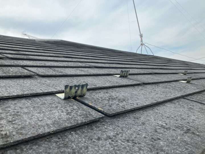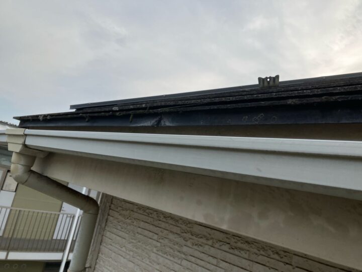 既存屋根材はスレート屋根です。石質の薄い板を使用しているため、劣化や反りがしやすい材料です。 -