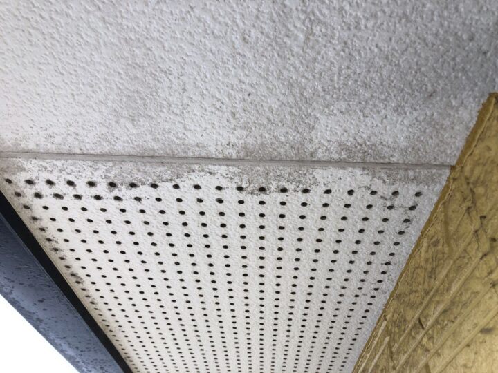 軒天部分にカビが見受けられます。今回、防カビ成分の入った軒天専用塗料を塗布することで素材を長持ちさせることができます。 -